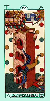 Cette lame est un autre aspect de la Mort. Face à cette carte, le consultant doit s'attendre à une destruction salutaire en vue d'une reconstruction, à l'accouchement au sens propre et au sens figuré: prise de conscience fulgurante. La tour foudroyée est une catastrophe pour certains, une bénédiction pour d'autres: tout dépendra des capacités de compréhension, d'assimilation et de réaction du sujet. " Veillez et priez car vous ne savez ni le jour ni l'heure "